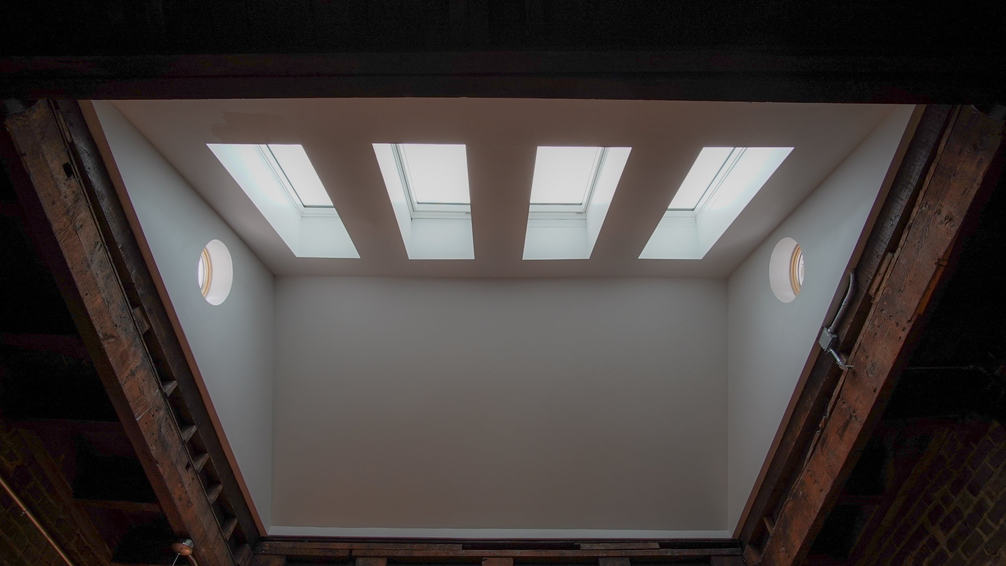 A new ptiched roof, cut through a flat timber roof, with four north-facing rectangular skylights and east-west porthole windows.